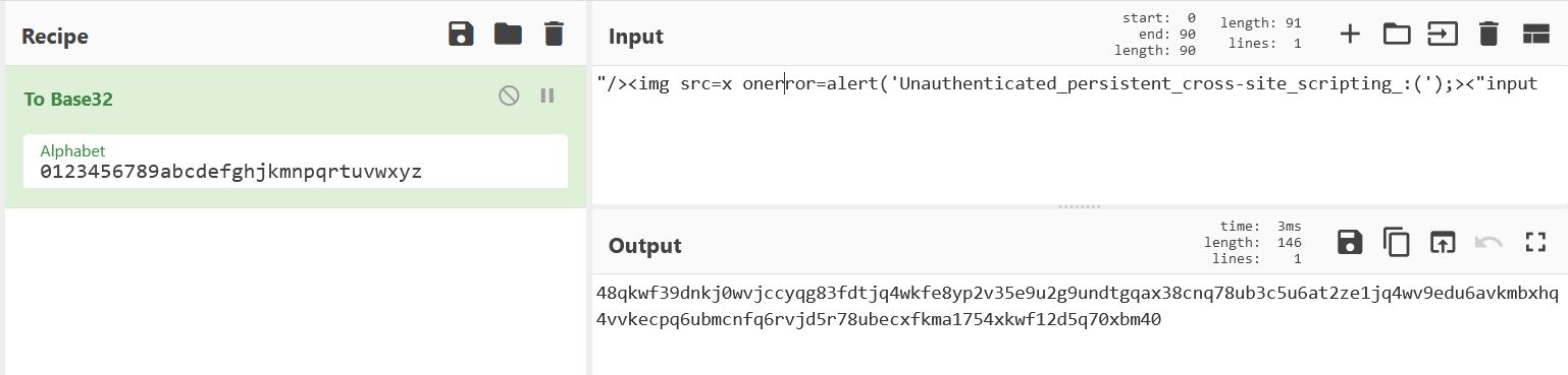 1. As the application encodes all data in Base32 we will start by encode our XSS payload.