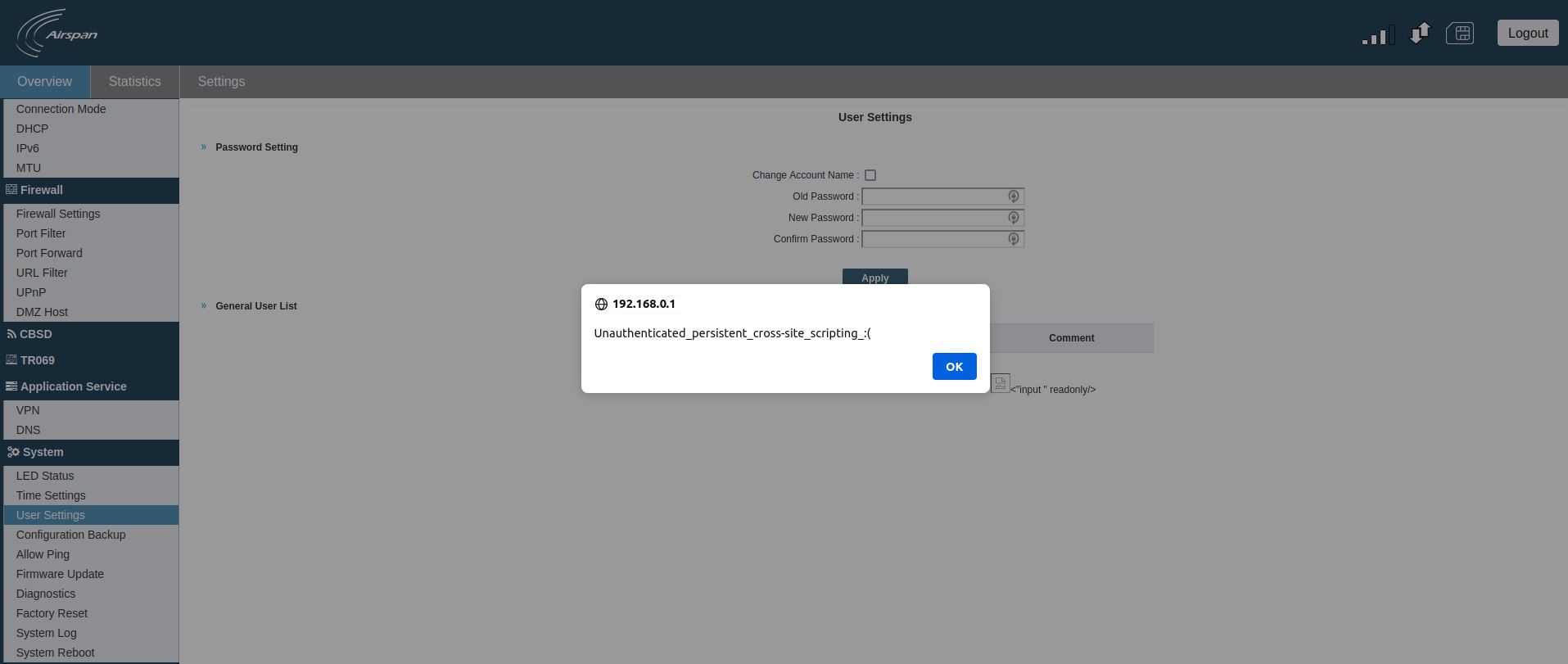 When a legitimate user access the User Settings page of the web management interface, the JavaScript payload will be triggered.