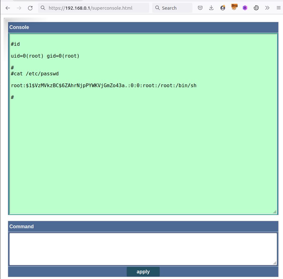 Vulnerability 4: The pages /home/www/superconsole.html and /home/www/cgi-bin/superconsole.cgi should be removed from the devices in production, as the default password is very weak admin:admin it is easy for any attacker to inject a backdoor on the device through this page.