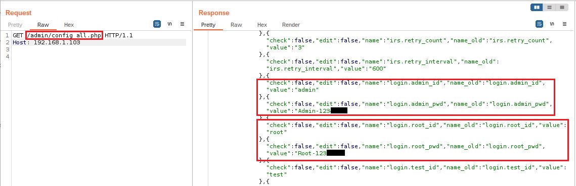 The endpoint /admin/config_all.php can be called remotely without user authentication as there is no cookie verification Cookie: SESS_IDS= to check if the request is legitimate and let any malicious actor grab all configuration variables such as the root and admin password.