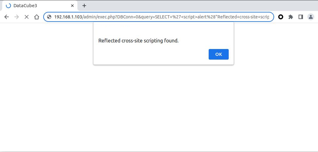 DataCube3 is affected by a reflected cross-site scripting (XSS) vulnerability due to an improper input sanitization. An authenticated, remote attacker can execute arbitrary JavaScript code in the web management interface. A successful exploit could allow the attacker to insert malicious JavaScript code. This issue affects all DataCube3 version 1.0.