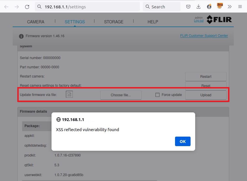 FLIR AX8 is affected by a reflected cross-site scripting (XSS) vulnerability due to an improper input sanitization. An authenticated, remote attacker can execute arbitrary JavaScript code in the web management interface. A successful exploit could allow the attacker to insert malicious JavaScript code. This issue affects all FLIR AX8 thermal sensor cameras version up to and including 1.46.16.