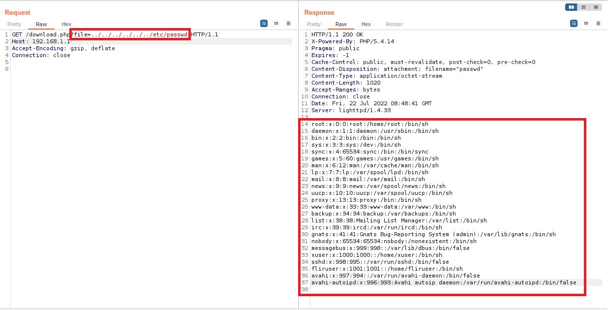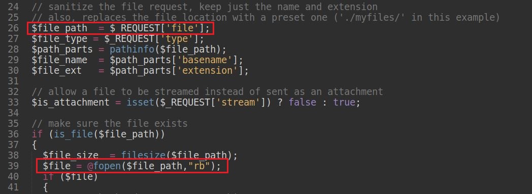 Vulnerability 2: The variable $file_path, line 39 in the file /FLIR/usr/www/download.php, must be sanitized using the function pathinfo() but also use a hard coded directory path, in case you need to manage several directories set a whitelist of all allowed directories and use multiple conditions.