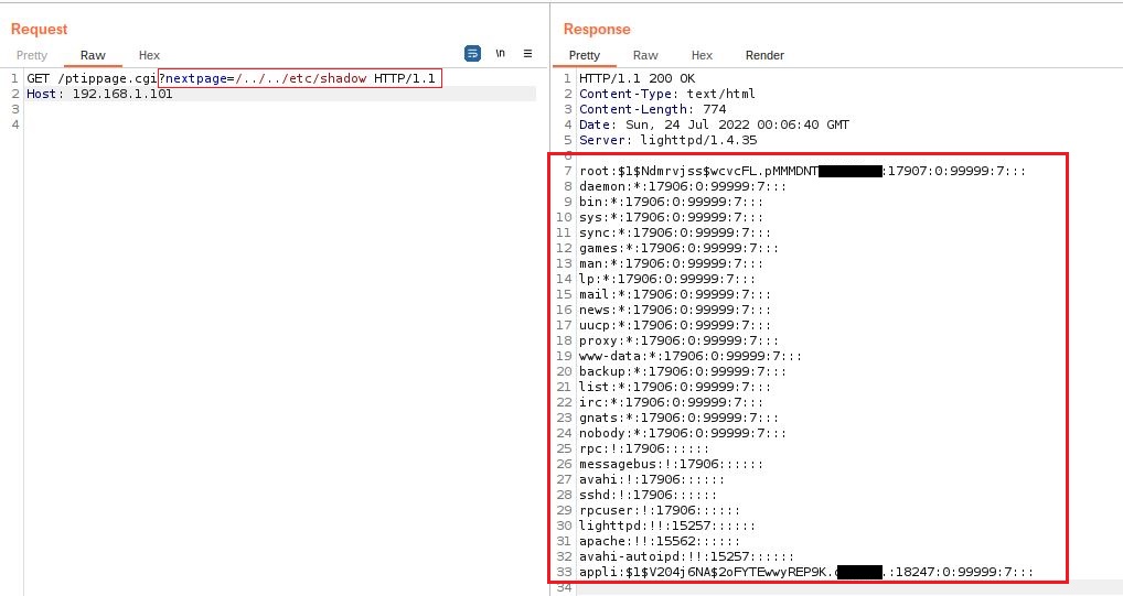 The endpoint /ptippage.cgi can be called remotely without user authentication as there is no authorization verification Authorization: Basic base64_str to check if the request is legitimate. The second problem is that the GET parameter nextpage