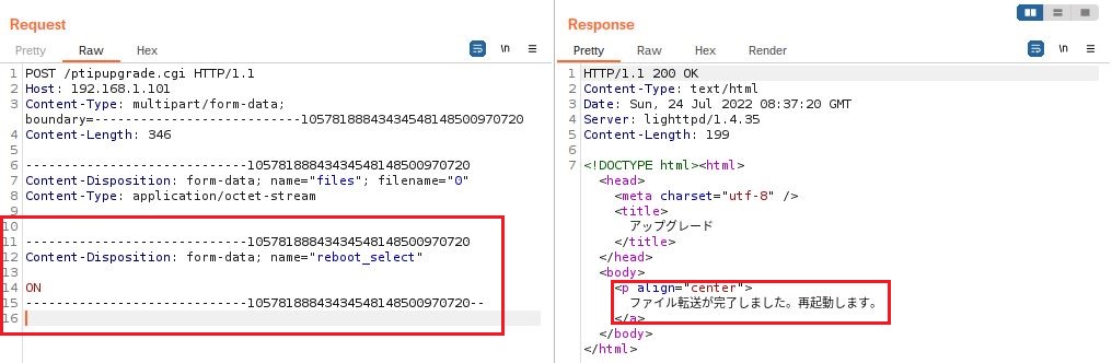 The endpoint /ptipupgrade.cgi can be called remotely without user authentication as there is no authorization verification Authorization: Basic base64_str to check if the request is legitimate and let any malicious actor to remotely reboot the device.