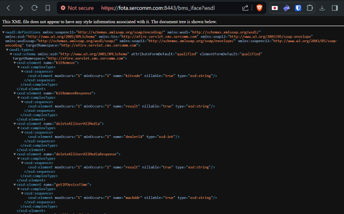 When attempting to connect, we are redirected without authentication to the page fota.sercomm.com:8443/bms_iface?wsdl, which displays a list of all SOAP (Simple Object Access Protocol) endpoints.