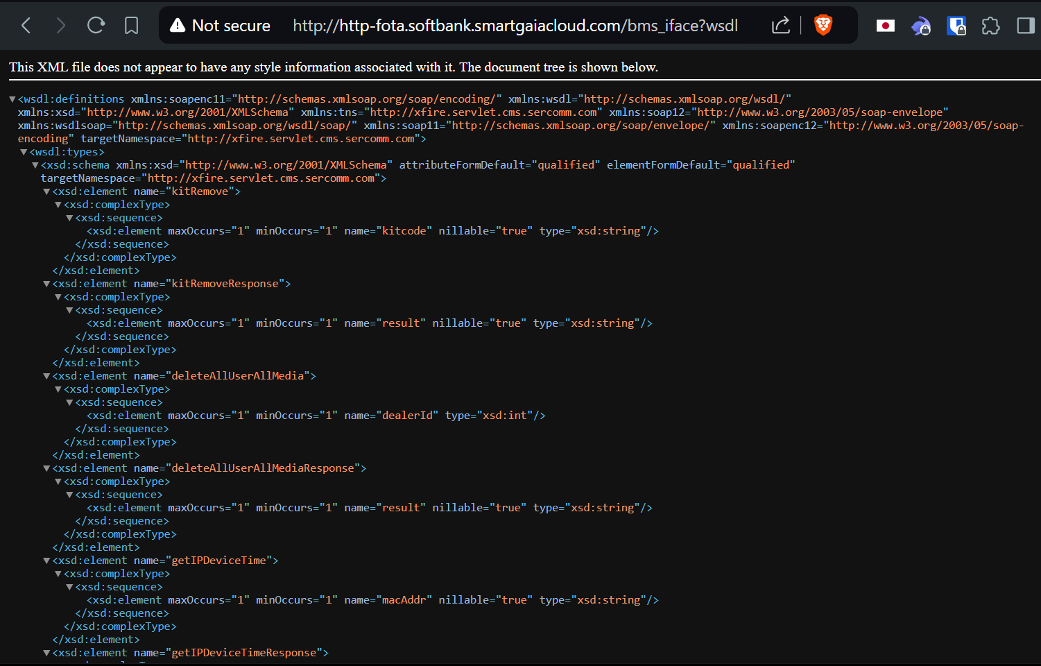 When attempting to connect, we are redirected without authentication to the page http-fota.softbank.smartgaiacloud.com:8443/bms_iface?wsdl, which displays a list of all SOAP (Simple Object Access Protocol) endpoints.